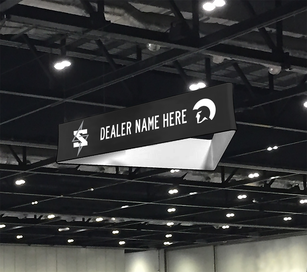 • 8' x 2' triangular hanging banner with lightweight aluminum frame and soft carry case